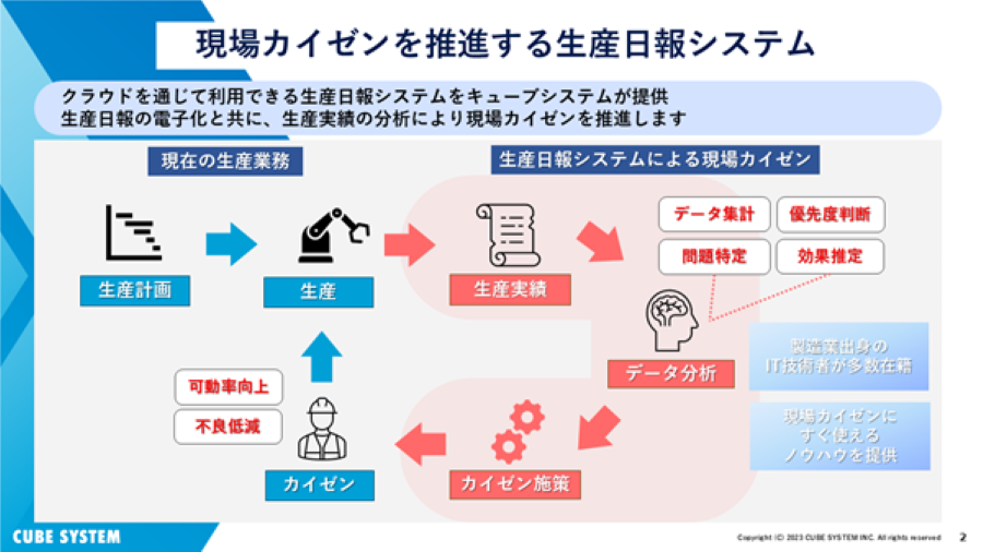 近年は受託開発にとどまらず、自社プロダクト開発にも注力しており、製造業の現場改善を支援するクラウド型生産日報システム「KAIZEN DOCK」を展開しています。現場の業務プロセスに即したシステム提供と継続的な改善支援を通じて、お客様の生産性向上とデジタル化の推進に貢献してまいります。